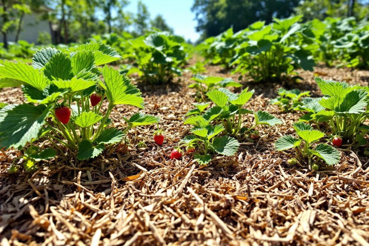 Les fraisiers, par leur nature adaptée, se développent mieux dans un sol bien paillé. Les différences de température peuvent atteindre 10°C au centre d'un paillis, permettant aux plantes de mieux résister au stress hydrique et de produire des fruits de qualité, moins sujets à la moisissure.