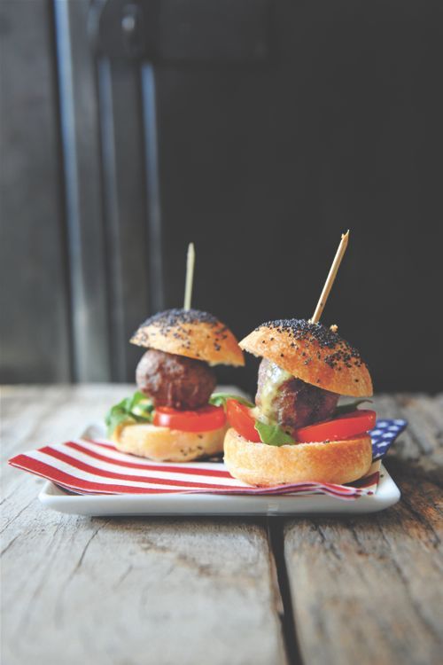 - Pour assembler, déposez un peu de salade dans les mini-pains, ajoutez des tranches de tomate et d'oignon, puis placez une boulette au centre. Ajoutez une cuillère à café de sauce et refermez vos mini-pains.