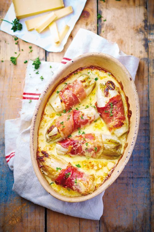 - Assaisonner avec du sel et du poivre. Envelopper chaque endive dans une tranche de speck et les disposer dans un plat de cuisson. Napper de sauce et saupoudrer de fromage.